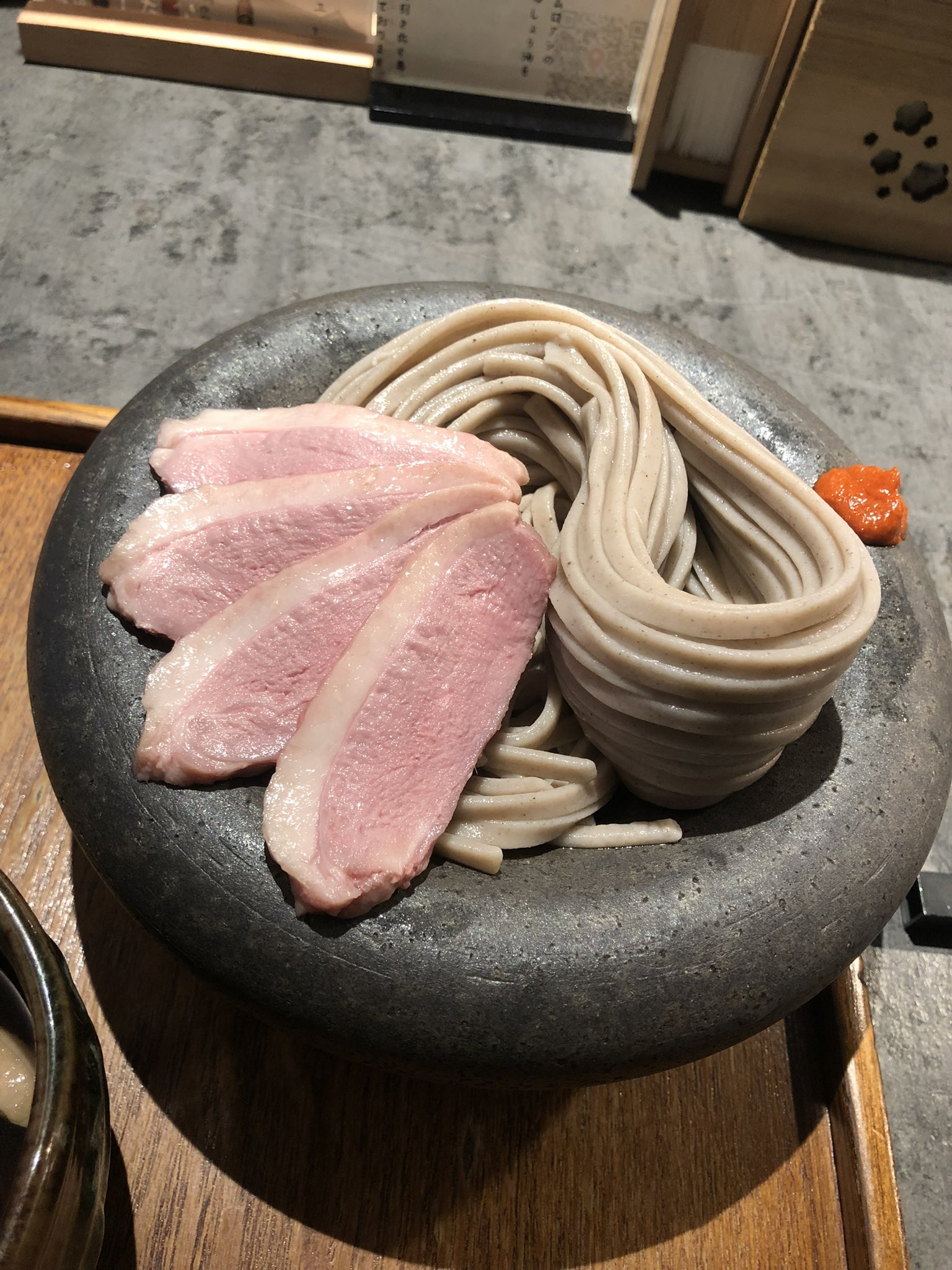 - 塩鴨のつけSOBAは約4倍の太さの二八そばに麺の太さに負けないつゆと低温調理した鴨肉で味変はハリッサ